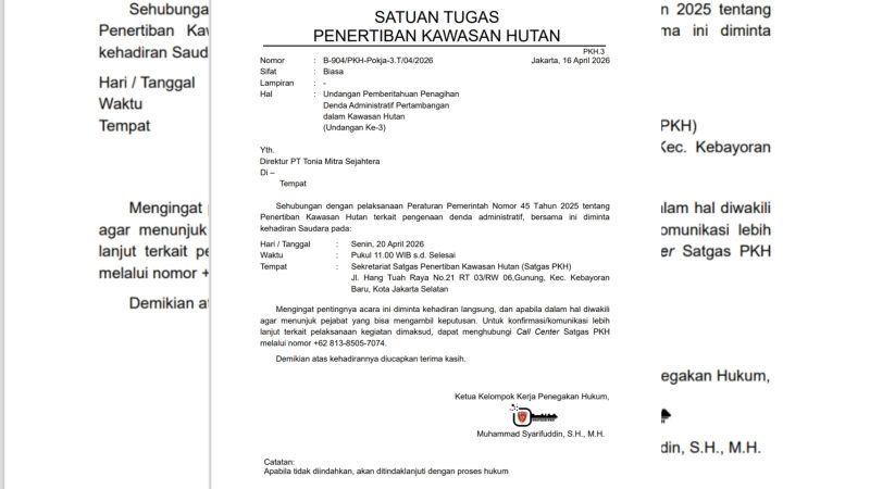 Panggilan Satgas PKH itu tertuang dalam surat bernomor: B-904/PKH-Pokja-3.T/04/2026 tertanggal 16 April 2026, perihal pemberitahuan penagihan denda administratif pertambangan dalam kawasan hutan.