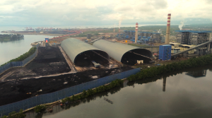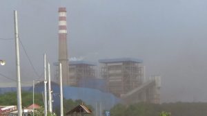 Debu batubara berterbangan di atas PLTU captive PT OSS, berdampingan dengan pemukiman warga. (Foto: Fadli Aksar)