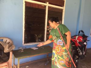 Surni (35) warga Desa Lambuluo, Kecamatan Motui, memperlihatkan debu batubara menempel di meja teras rumahnya, padahal baru satu jam dibersihkan. (Foto: Fadli Aksar)